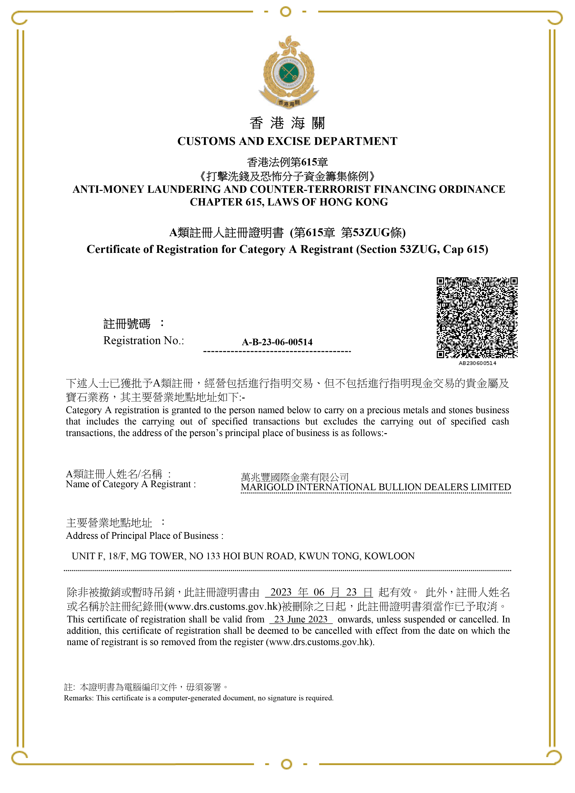 香港海关A类注册人注册证明书 资质查询 注册号码:A-B-23-06-00514 已获批香港海关A类注册,经营包括进行指明交易,但不包括进行指明现金交易的贵金属及宝石业务,此注册证明书由2023年06月23日起有效 香港黄金交易所会员:023号 资质查询 黄金业务 根据香港特别行政区政府公司法成立于2007年6月6日。香港黄金交易所会员号码:023号,获准在香港经营贵金属现货、杆杠式按金交易或及接受全球经纪伙伴业务。