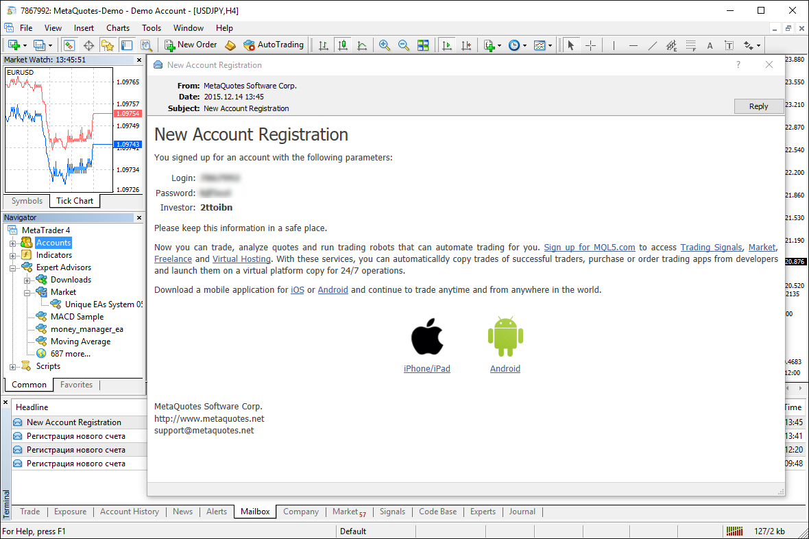 下载MetaTrader 4,获得市场上最强大,最便捷的技术分析和交易工具。第一次启动之前,系统将提示您新建一个免费的模拟账户,允许您测试所有交易平台的功能。