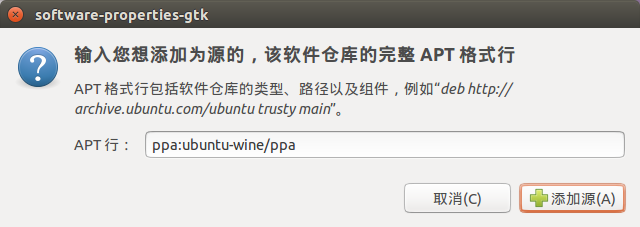 应于 APT (高级软件包工具) 行中指定下述数据:ppa:ubuntu-wine/ppa.单击 "Add Source" (添加源)。如此则完成了初步设置。
