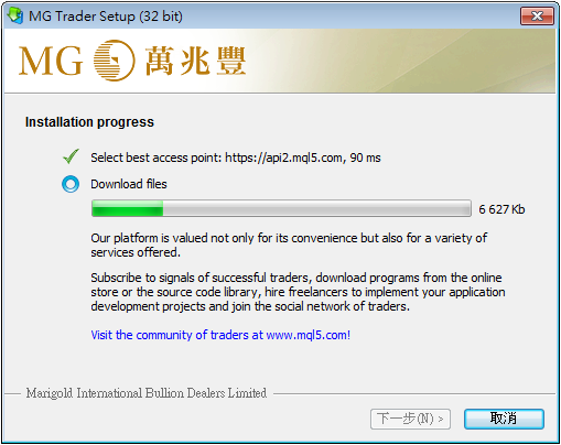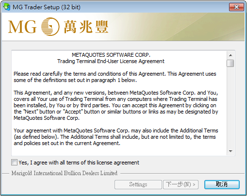 閱讀並扣上同意全部條款,按「下一步」繼續安裝,請保持您的電腦處於聯網狀態,安裝程序自動從服務器下載最新交易平臺版本並安裝